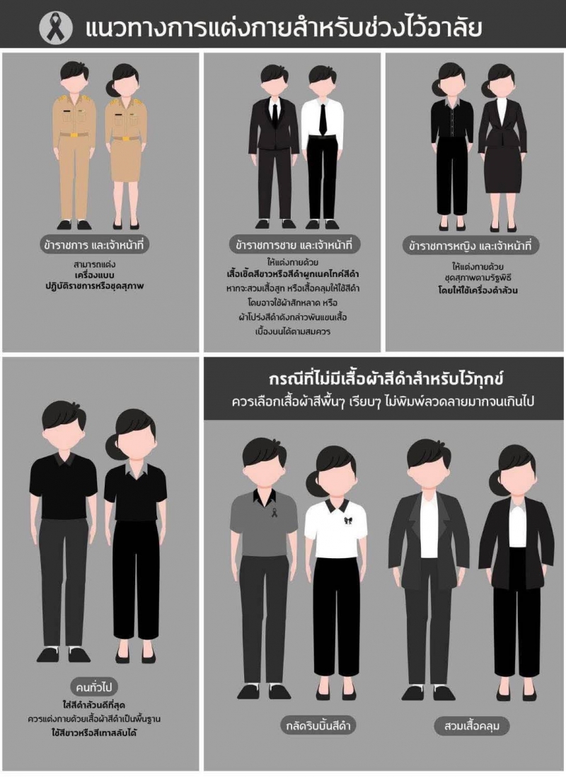 ประชาสัมพันธ์/เเนวทางการเเต่งกายในช่วงไว้ทุกข์ สำหรับข้าราชการเเละประชาชนทั่วไปทั้งนี้พิจารณาได้ตามความเหมาะสม
