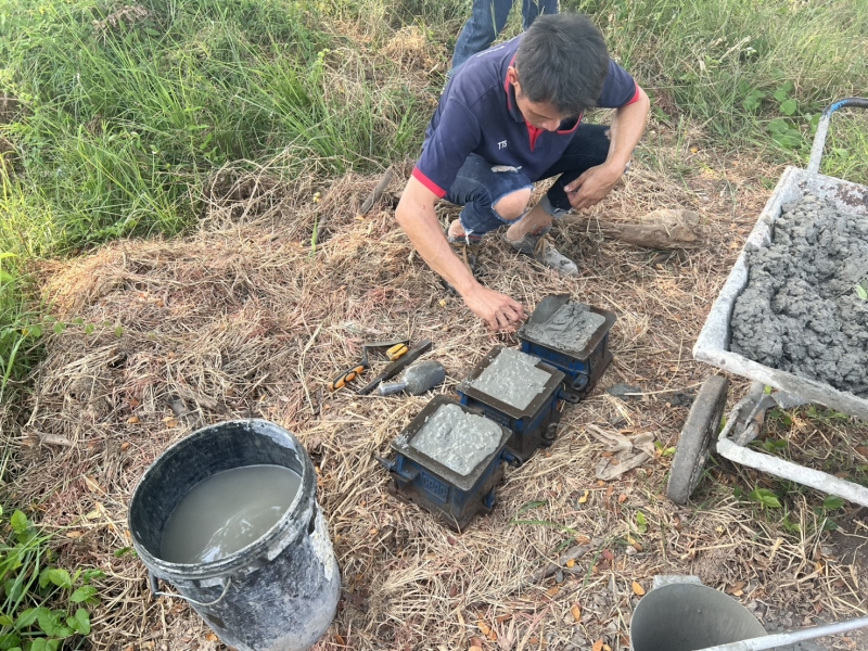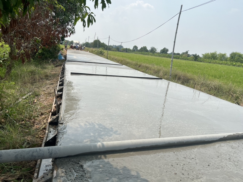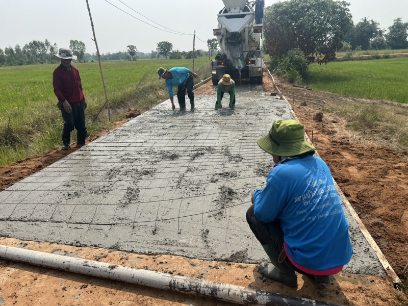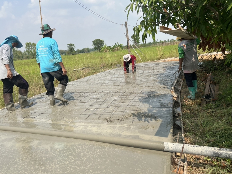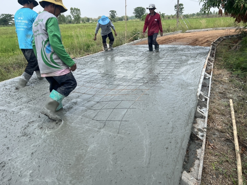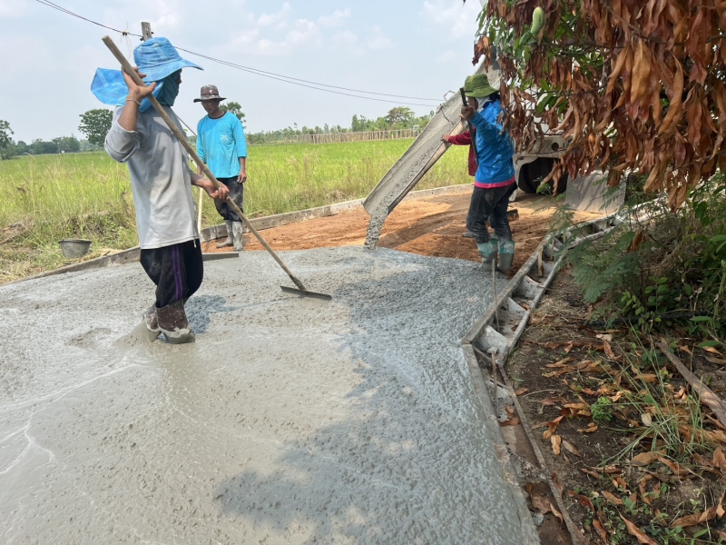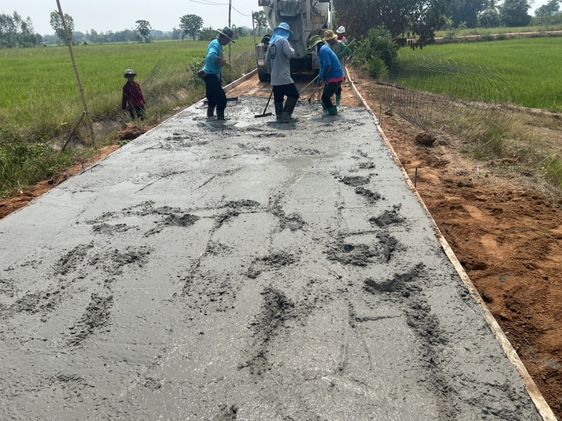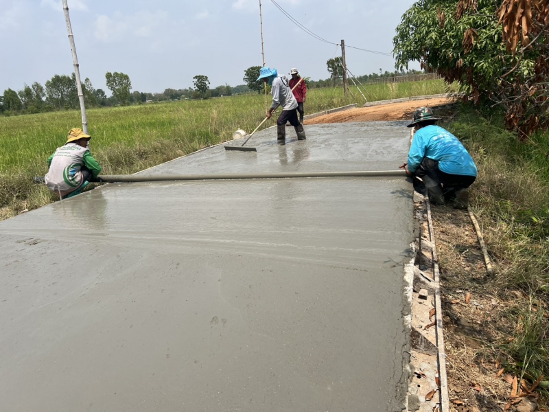 โครงการก่อสร้างถนนคอนกรีตเสริมเหล็ก หมู่ที่ 5 (งบประมาณจ่ายขาดเงินสะสม ปี 2568) ผู้รับจ้างดำเนินการปรับทรายรองพื้นและเทคอนกรีตผิวจราจร ขนาดกว้าง 3.50 เมตร ยาว 60 เมตร