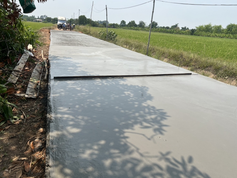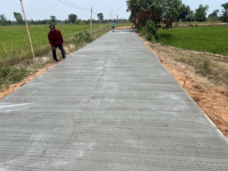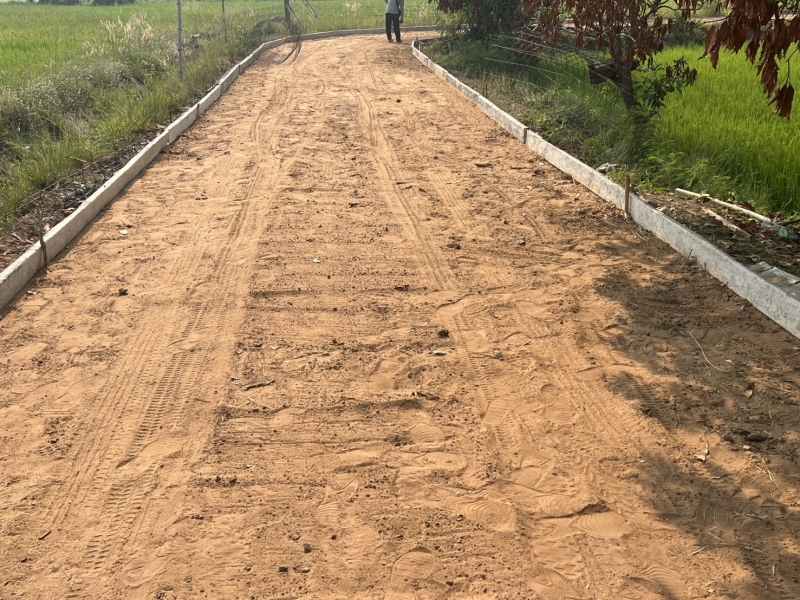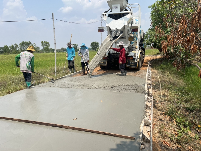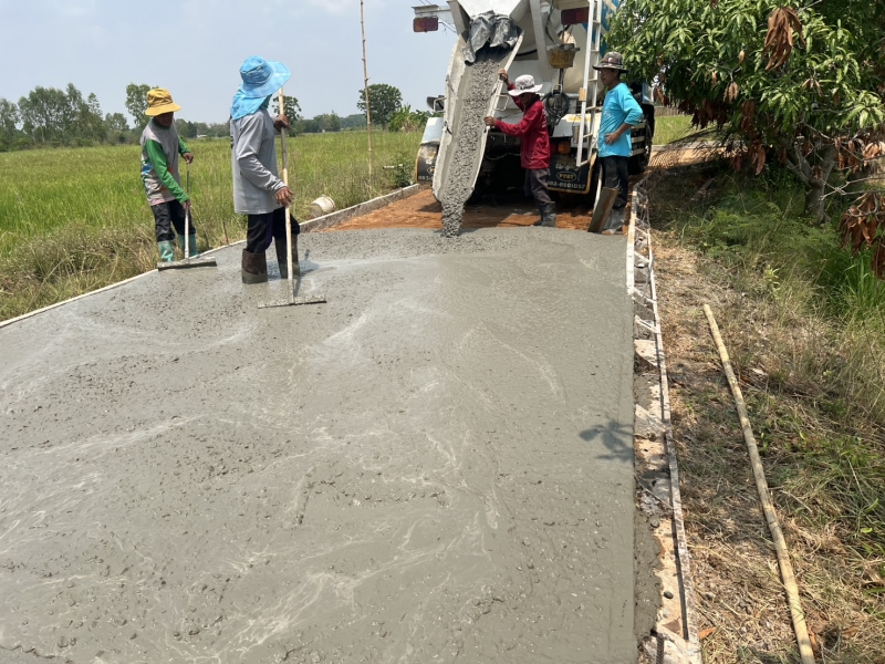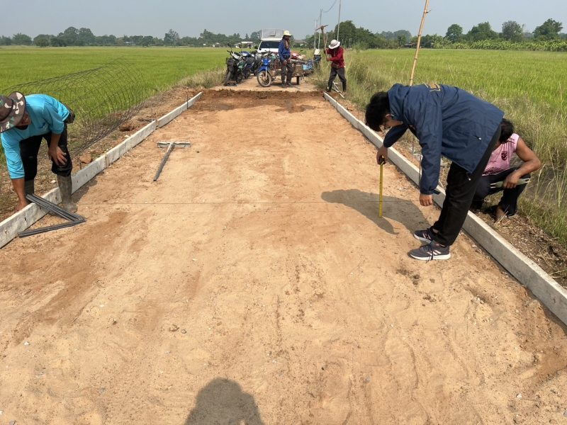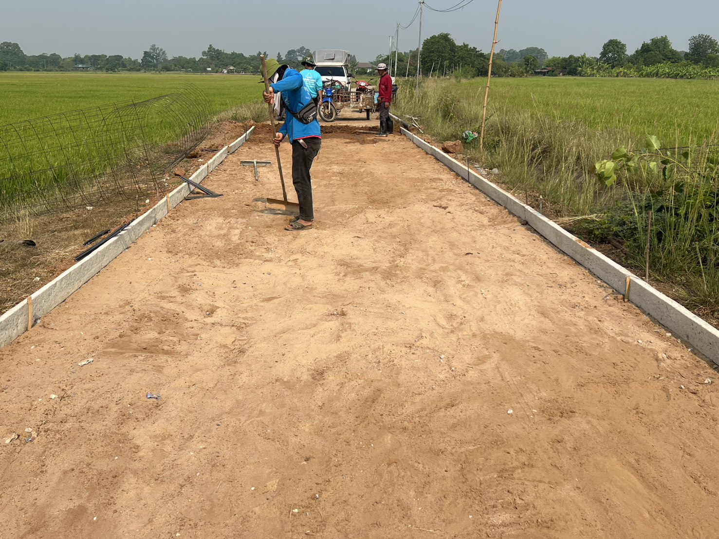 โครงการก่อสร้างถนนคอนกรีตเสริมเหล็ก หมู่ที่ 5 (งบประมาณจ่ายขาดเงินสะสม ปี 2568) ผู้รับจ้างดำเนินการปรับทรายรองพื้นและเทคอนกรีตผิวจราจร ขนาดกว้าง 3.50 เมตร ยาว 60 เมตร